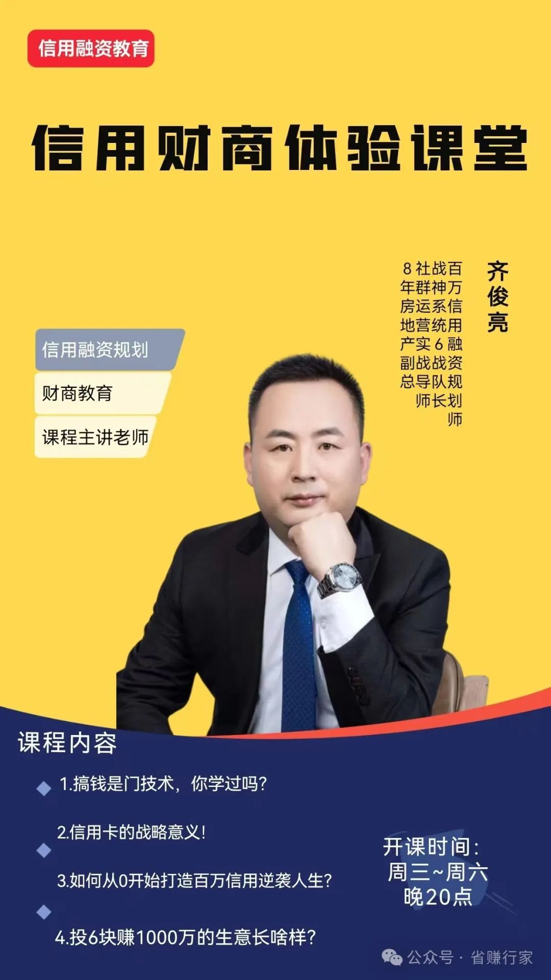 看文章不过瘾,邀请你来参加我们每周四天的信用知识公益课程,周三到周六每晚20:00-21:00,四节课打通你的财富认知?